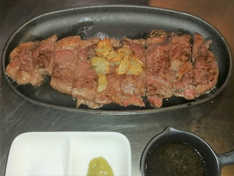 焼き方が選べ、「和牛サーロインステーキ」(3,900円)は柔らかくジューシーな食感を味わえるレアがおすすめ。塩、ワサビ、特製おろしだれの3種類が付く。