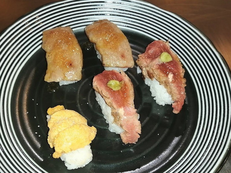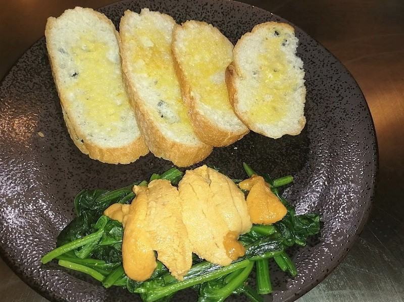 ほかに、ヒレやロースなど和牛肉4種とウニの5貫を堪能できる「和牛握り寿司食べ比べ」(2,000円)や、塩と和風だしで炒めたホウレン草とウニ、バケットの絶妙なハーモニーがお酒に合う「ウニホーレン」(1,500円)も人気。