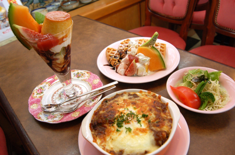 カフェコーナーの机は店主たちの手作り。イスはヨーロッパからアンティークなものを取り寄せる。
