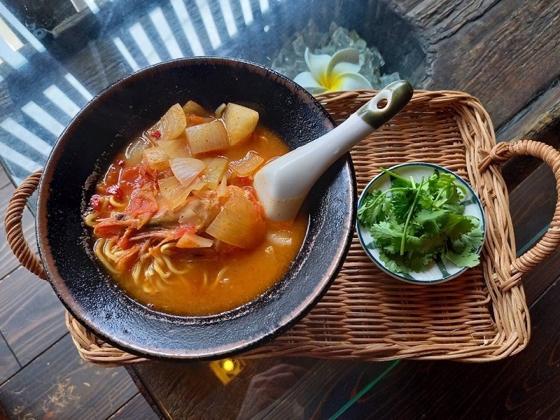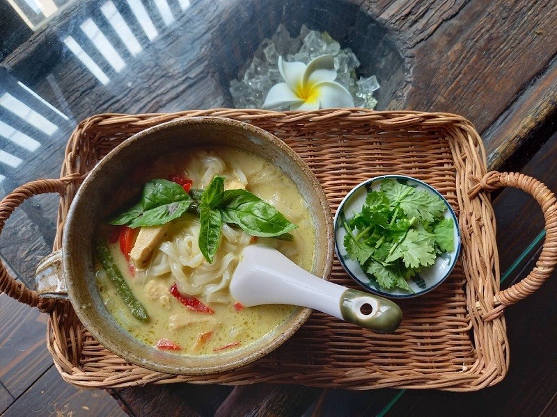 自家栽培したクセのない無農薬バジルを使用し、鶏ひき肉とカラフルな地元野菜をナンプラーなどで味付け。