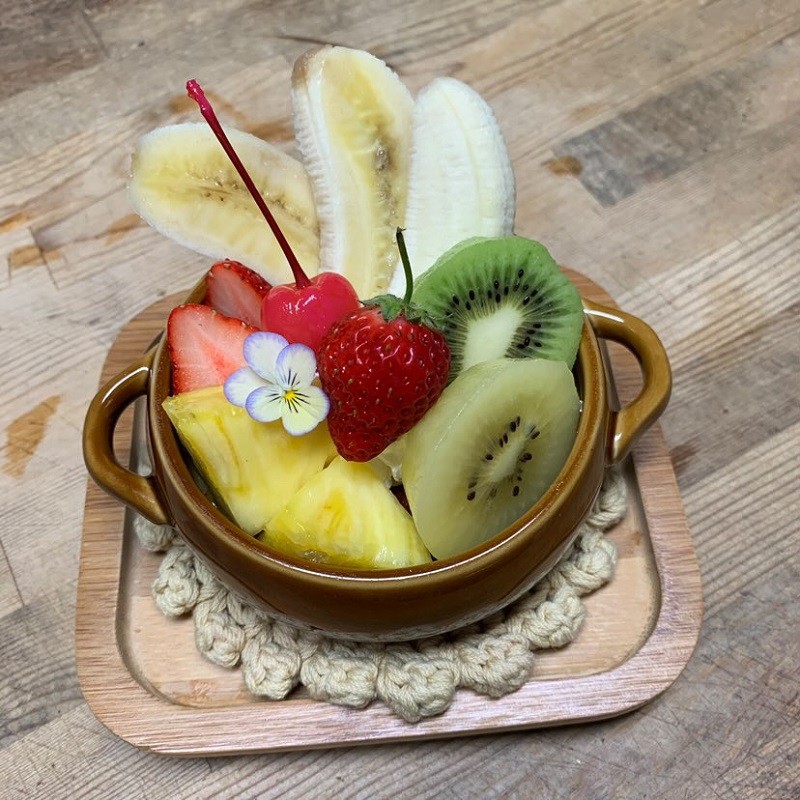 ふわふわ食感生地にクリームがサンドされ、季節のフルーツがトッピング。