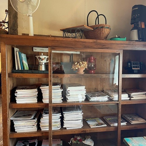 くつろぎアイテムとして、レトロな本棚には雑誌が置いてある。