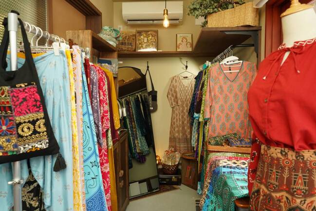 ニットをはじめとする服やアクセサリーなどのオリジナル商品の販売と、手づくり教室も開き、さまざまな技法を指導。