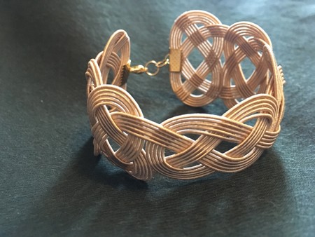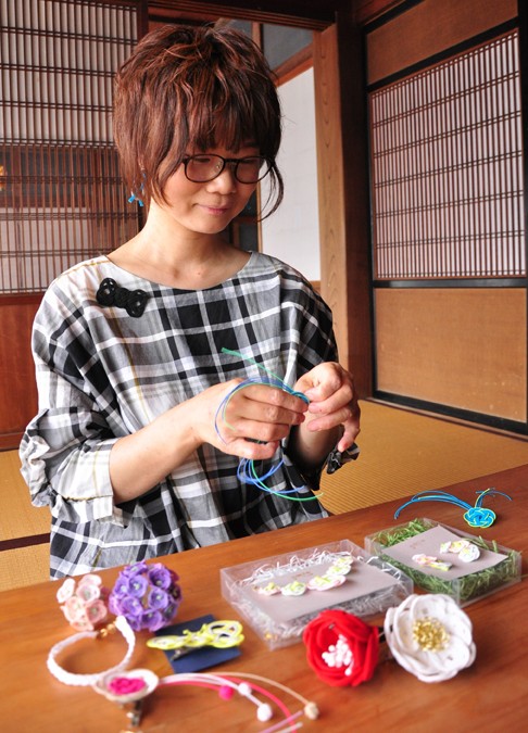 「『人生はゴッコ遊び』をテーマに、遊びながら自由に自分が欲しいと思うものを形にしている」と笑顔で話す。結ぶ固さや大きさ、何本取りで色の順番はどうするかなど、その表現は限りなく、感性の赴くまま手を動かす。