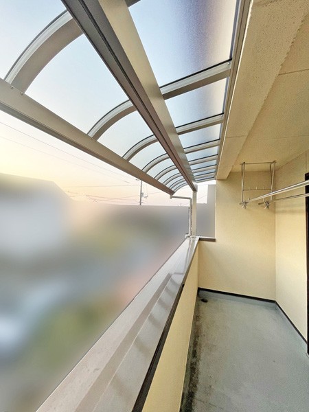 晴れた日は洗濯物を2階のベランダに干す方も多いと思います。写真のお宅は建物と一体のベランダがありましたが、軒の出がベランダより短いため※躯体(くたい)に取り付けるタイプのアルミ製屋根を延長して設置しました。室内が暗くならないように明かりを通すポリカを用いて、見た目も軽やかです。