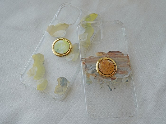 実は作家の顔も持つオーナーが手掛けるのは、クリアケースに複数の色の絵の具をのせ、描く時に偶然生まれる色や柄のデザインが、単一でない魅力を生み出すスマホケース(2,200円~)。
