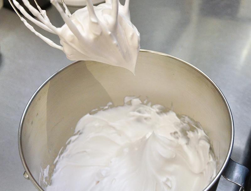 (7)残りのメレンゲも加え、ヘラで泡を消さないように注意して全体を混ぜる。
