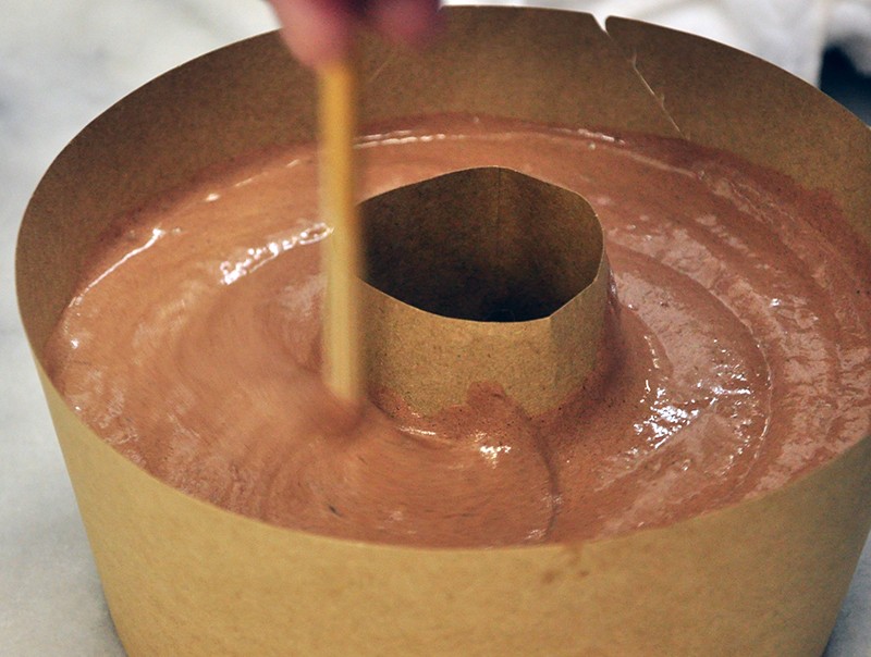 (8)生地を型に入れてお箸で全体を混ぜ(写真(2))、型を台に2、3回落として中の空気を抜き、180度のオーブンで約35分焼く。