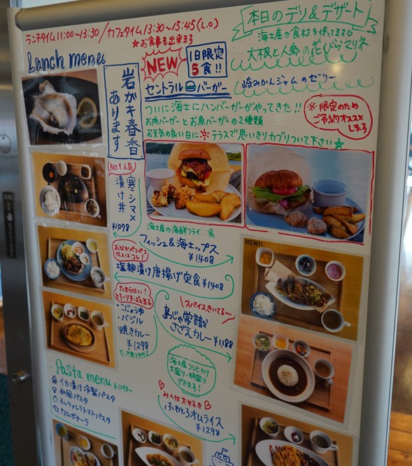 他にも、1日限定5食のセントラルバーガー(肉・魚と選択可、予約推奨)や、さざえカレー(1,188円)、岩ガキ春香(はるか)など目移りしそうなご島地メニューや、洋食、お子様ランチ(858円、中学生まで)やスイーツもある。