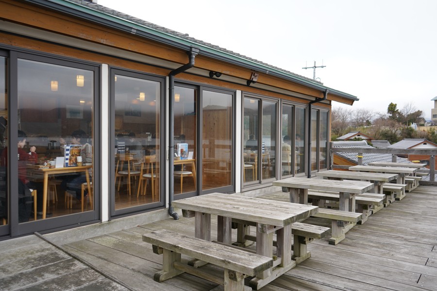 おしゃれな音楽が流れる店内は、大きな窓ガラスからきれいな海が眺められる。テラス席も◎。フェリーを眺めながら楽しむ食事は、旅気分が一層強くなる。ゆっくりできるなら、カフェタイムにも訪れてみたい。