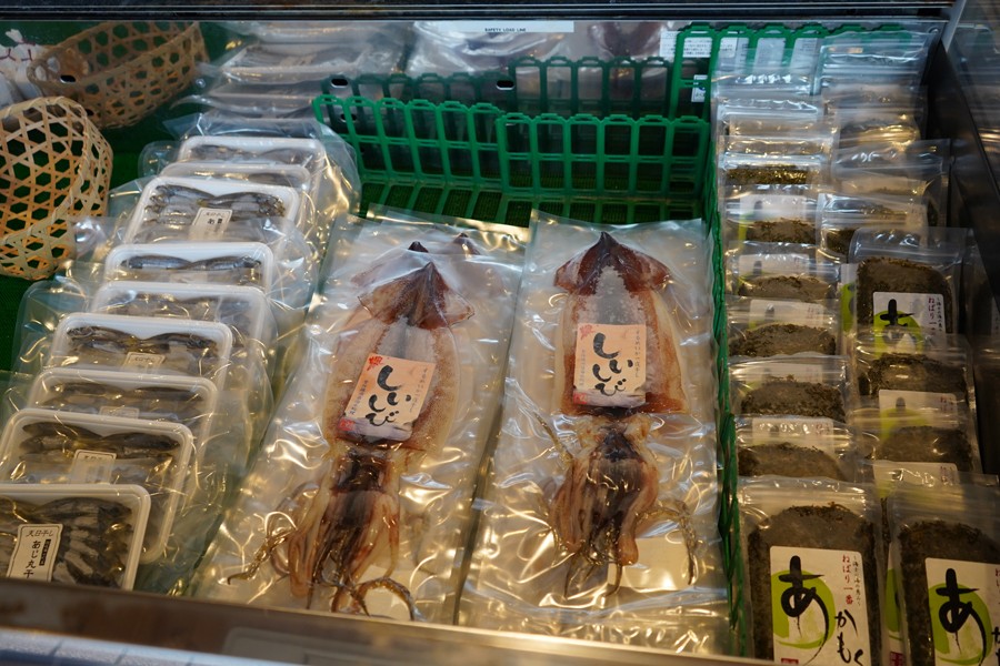 岩ガキや新鮮な魚、一夜干し(しぃしび)などが購入できる「大漁」。おいしそうな海の幸がずらり。これを買ってキャンプをし、BBQをしてみたい。