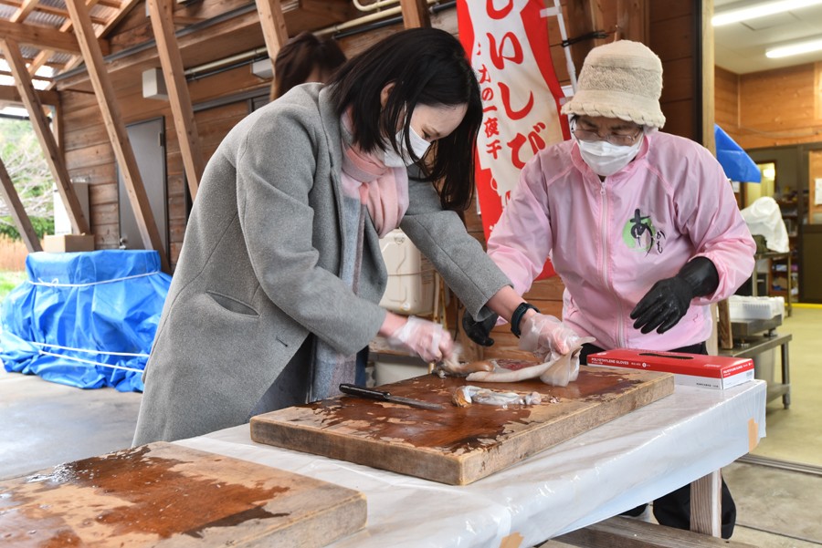 豊田港に到着。海士町産のイカをさばき、しぃしび(一夜干し)へ加工する体験ができる。丁寧に教えてもらえて簡単にさばけるかと思いきや苦戦! さばき終わると達成感がある。