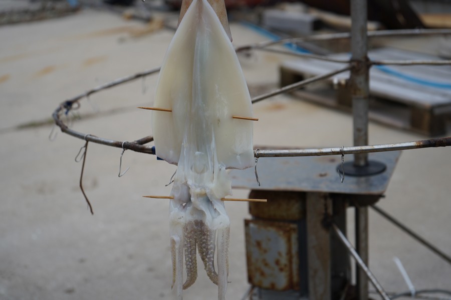さばいたイカはよく洗い、専用の機械に干してスイッチオン♪ イカがくるくる回り始める。この風景は隠岐の風物詩だそう。一昼夜まわして干したイカは、適度に水分がとび、甘みが増す。干しあがったイカは翌日お土産にいただいた。これを炙ってお酒のあてにするのが楽しみだ!